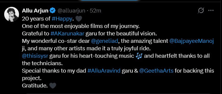 బన్నీ ట్వీట్ విశేషాలు: “హ్యాపీ సినిమాకి 20 ఏళ్లు.. నా సినీ ప్రయాణంలో నేను అత్యంత ఎంజాయ్ చేసిన సినిమాల్లో ఇది ఒకటి. ఇంత మంచి విజన్ ఇచ్చిన డైరెక్టర్ కరుణాకరన్ గారికి, నా అద్భుతమైన కో-స్టార్ జెనీలియాకి స్పెషల్ థాంక్స్” అంటూ బన్నీ రాసుకొచ్చారు.
