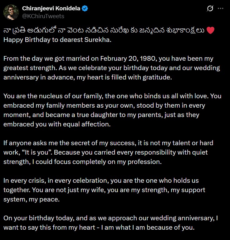 సురేఖ గారు కేవలం చిరంజీవి భార్యగానే కాకుండా, కొణిదెల కుటుంబానికి (Mega Family) ఒక అతుకురాయిలా నిలిచారని చిరు కొనియాడారు. “నా తల్లిదండ్రులను నీ సొంత తల్లిదండ్రులుగా చూసుకున్నావు. ప్రతి కష్టంలో, ప్రతి సంబరంలో మనందరినీ కలిపి ఉంచింది నువ్వే. నువ్వు నా భార్యవి మాత్రమే కాదు.. నా బలం, నా ప్రశాంతత” అని చిరు రాసుకొచ్చారు.