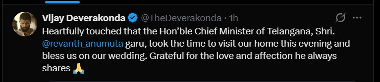 “తెలంగాణ సీఎం రేవంత్ రెడ్డి గారు మా ఇంటికి విచ్చేసి, మా కొత్త జంటను ఆశీర్వదించడం నా మనసుకు చాలా హత్తుకుంది. ఆయన ఎప్పుడూ పంచే ప్రేమ, ఆప్యాయతలకు ఎప్పటికీ కృతజ్ఞుడిని” అని విజయ్ దేవరకొండ పేర్కొన్నారు. ముఖ్యమంత్రితో తీసుకున్న ఫోటోలను కూడా ఆయన షేర్ చేశారు.