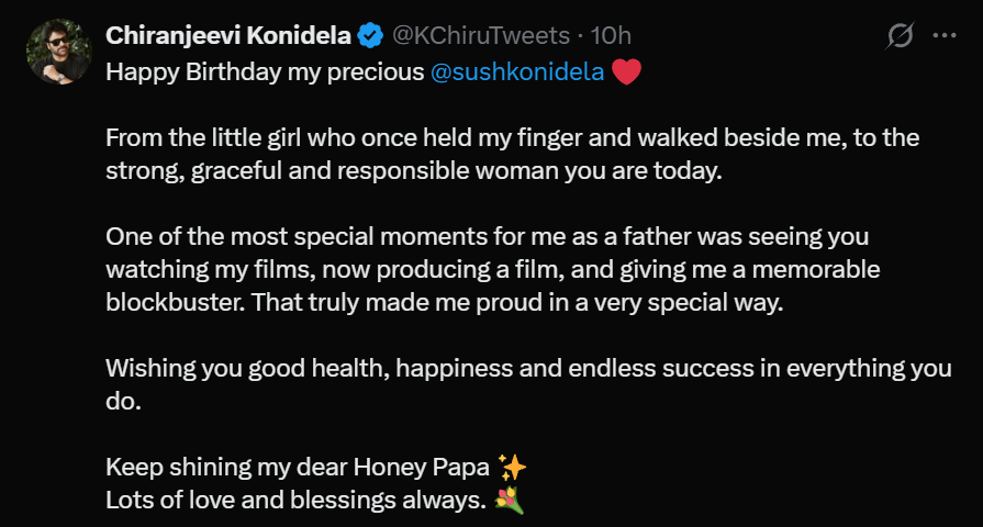 నా వేలు పట్టుకు నడిచిన చిన్నారి: తన గారాల పట్టికి బర్త్‌డే విషెస్ చెబుతూ చిరంజీవి గారు ఎంతో ఎమోషనల్ అయ్యారు. “నా వేలు పట్టుకుని నడిచిన ఒక చిన్నారి స్థాయి నుంచి.. ఈరోజు ఒక స్ట్రాంగ్, గ్రేస్ ఫుల్ మరియు బాధ్యతాయుతమైన మహిళగా నువ్వు ఎదగడం చూస్తుంటే ఎంతో ఆనందంగా ఉంది. నా ప్రియమైన సుష్మితకు పుట్టినరోజు శుభాకాంక్షలు” అని మెగాస్టార్ రాసుకొచ్చారు.